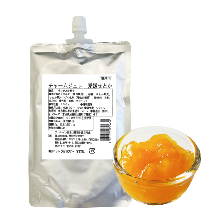 愛媛県産せとか果皮と果汁を使用した、コクのある甘さとまろやかな酸味のバランスが特長のトッピング用ジュレです。