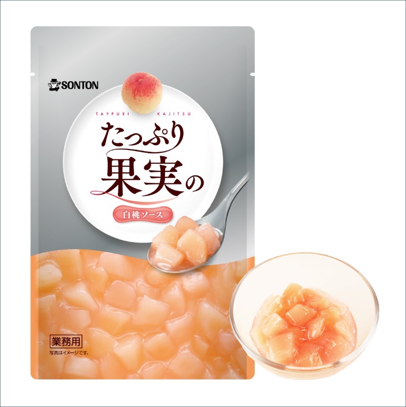 白桃果肉を約70%配合し、ジューシーな白桃の食感と甘く華やかな香りが感じられる白桃ソースです。