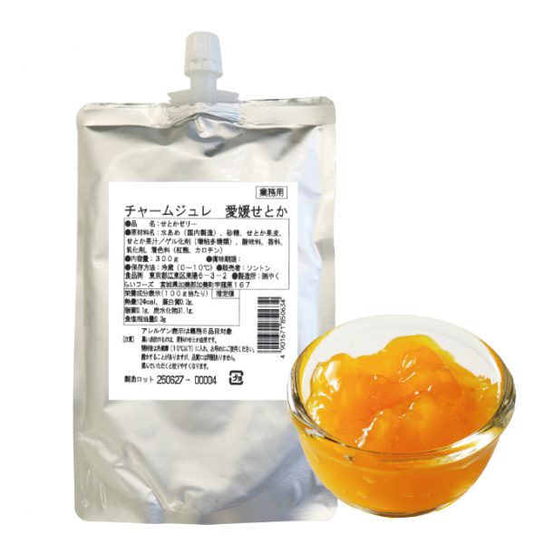 愛媛県産せとか果皮と果汁を使用した、コクのある甘さとまろやかな酸味のバランスが特長のトッピング用ジュレです。