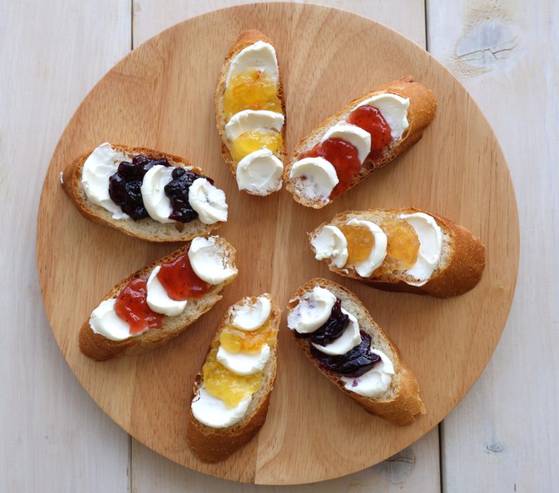 ジャムとクリームチーズのウェーブバゲット( ファミリーカップ つぶつぶイチゴジャム/ファミリーカップ ごろごろブルーベリージャム/ファミリーカップ 果皮ざくざくマーマレード/ファミリーカップ しゃきしゃきリンゴジャム )