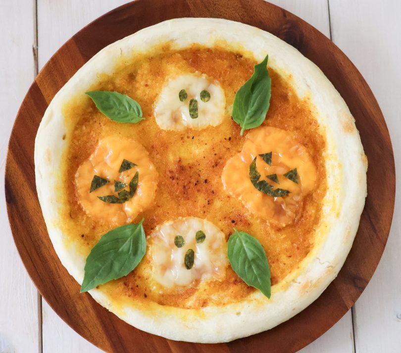 2種類のチーズを使って、ハロウィンにぴったりなピザに仕上げました。